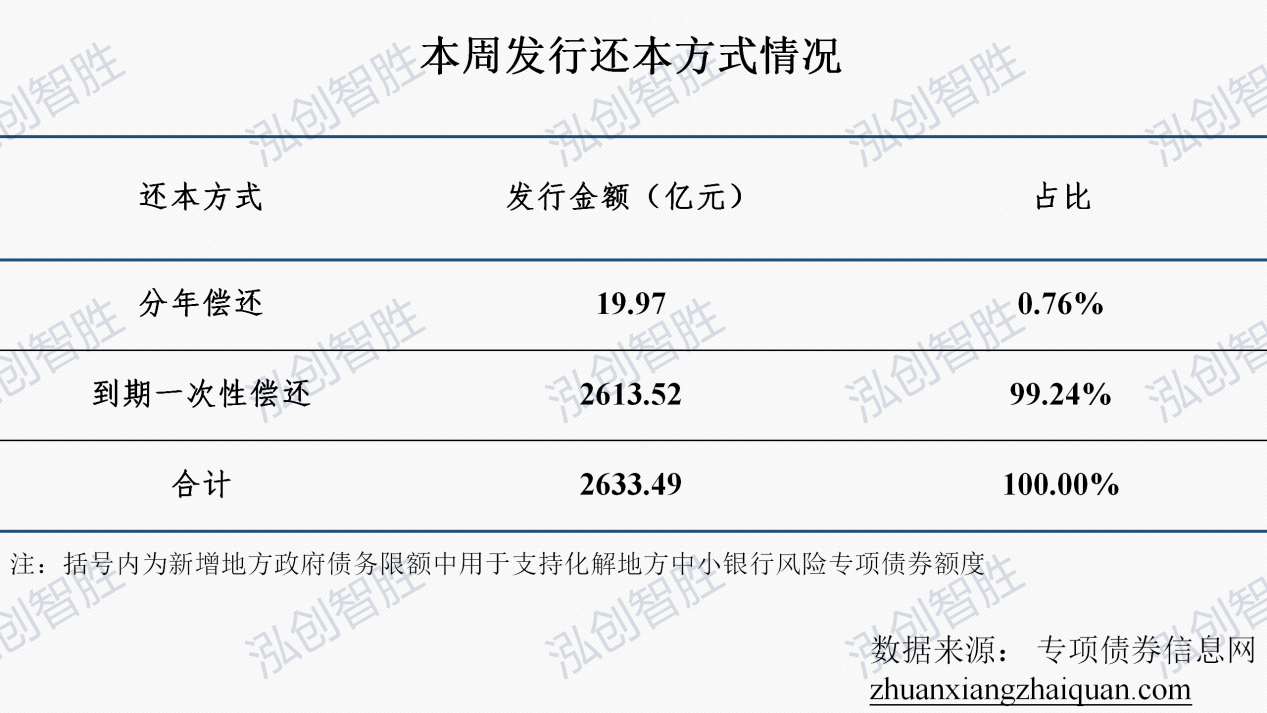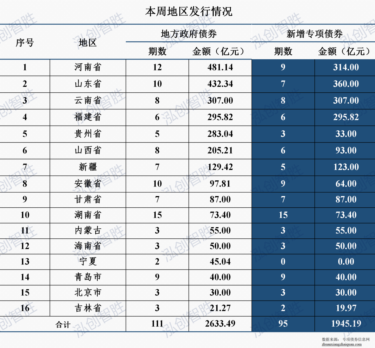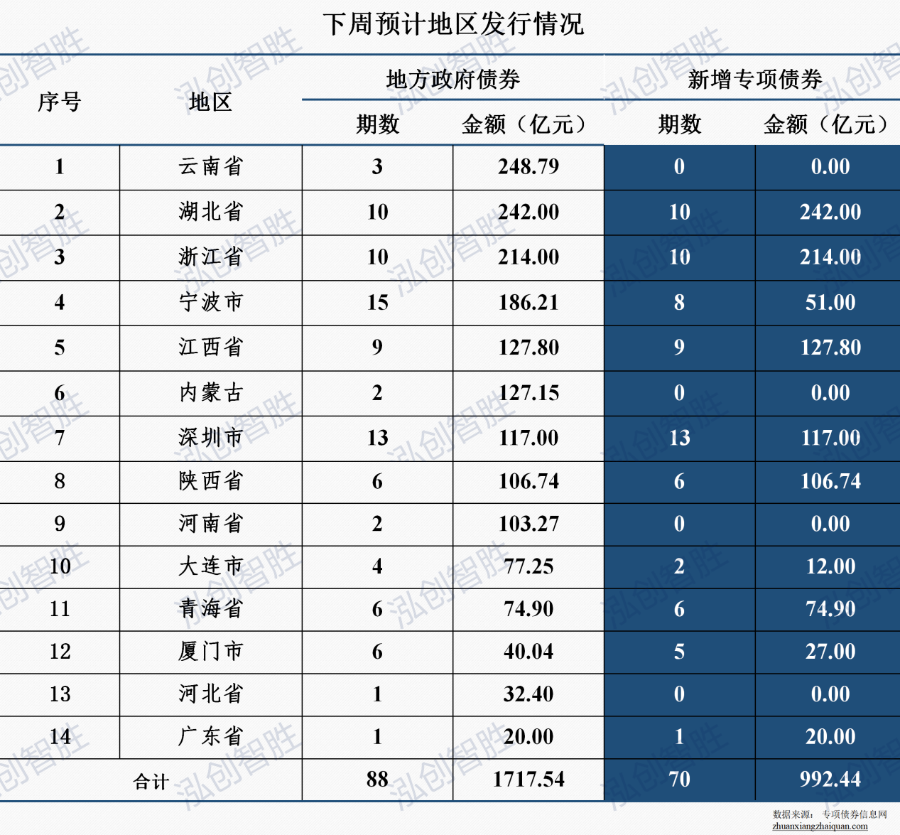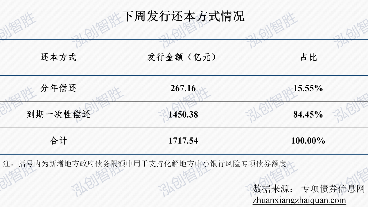 专项债券2349.07亿元,一般债券284.41亿元;新增债券2002.98亿元(其中专项债券1945.19亿元),再融资债券630.50亿元。本周共有16个地区(河南、山东、云南、福建、贵州、山西、新疆、安徽、甘肃、湖南、内蒙古、海南、宁夏、青岛、北京、吉林)发行111期地方政府债券,合计2633.49亿元。其中,新增专项债券95期,除宁夏外15个地区均有发行新增专项债券计划,合计发行额1945.19亿元。本周海南在香港簿记建档发行3期不超过50亿元离岸人民币地方政府债券,并在香港交易所挂牌上市,发行期限为2/3/5年期。本次是海南省首次在境外发行地方政府债券,2年期为蓝色债券,3年期和5年期为可持续发展债券,募集资金将投向海洋经济及海洋保护项目、绿色环保项目、医疗及住房等民生保障项目,进一步落实国家海洋发展战略,推进绿色低碳和可持续发展。本周地方政府债券平均期限为17.05年,其中新增专项债券平均期限17.45年。本周发行新增专项债券涉及八种期限类型,包括2年期、3年期、5年期、7年期、10年期、15年期、20年期、30年期,其中30年期占比最多,为23.73%,其次是20年期,占比22.93%,再次是15年期,占比22.03%。本周发行2期分年偿还新增专项债券,发行规模合计19.97亿元。其余均采取到期一次性还本,合计2633.52亿元。下周地方政府债券预计发行规模1717.54亿元,其中专项债券1254.29亿元,一般债券463.24亿元;新增债券992.44亿元(全部为新增专项债券),再融资债券725.10亿元。其中,河北发行一期再融资专项债券柜台债,商业银行柜合发行不超过5亿元。下周预计共有14个地区(云南、湖北、浙江、宁波、江西、内蒙古、深圳、陕西、河南、大连、青海、厦门、河北、广东)计划发行88期地方政府债券,其中,新增专项债券70期,涉及湖北、浙江、江西、深圳、陕西、大连、青海、厦门、广东等9个地区,合计发行额992.44亿元。深圳市计划于近期在香港簿记建档发行不超过50亿元离岸人民币地方政府债券,并将在香港联合交易所挂牌上市,发行期限为2/3/5年期。本次发行的地方政府债券中,3/5年期为绿色债券和蓝色债券,募集资金将投向轨道交通、水污染治理等项目,加快发展方式绿色转型,共建绿色粤港澳大湾区,推进绿色、循环、低碳发展。具体发行安排将及时公布。广东省政府计划近期在澳门特别行政区通过簿记建档方式发行离岸人民币地方政府债券20亿元(发行期限为3年期),届时将在澳门中央证券托管结算一人有限公司登记、托管及清算,并在中华(澳门)金融资产交易股份有限公司挂牌上市。本次发行募集资金将投向重大基础设施项目。具体发行安排将适时公布。下周预计发行地方政府债券平均期限为13.03年,其中新增专项债券平均期限17.45年(均不含未分2/3/5年期的50亿元境外债)。下周预计发行新增专项债券涉及八种期限类型,包括2年期、3年期、5年期、7年期、10年期、15年期、20年期、30年期,其中20年期占比最多,为40.65%,其次是15年期,占比19.36%,再次是15年期,占比13.11%。下周深圳、湖北计划发行13期分年偿还新增专项债券,发行规模合计267.16亿元。其余均采取到期一次性还本,合计1450.38亿元。20年期在第6-15年每年偿还债券本金的6%,第16-20年每年偿还债券本金的8%。附表1-2022年截至10月30日