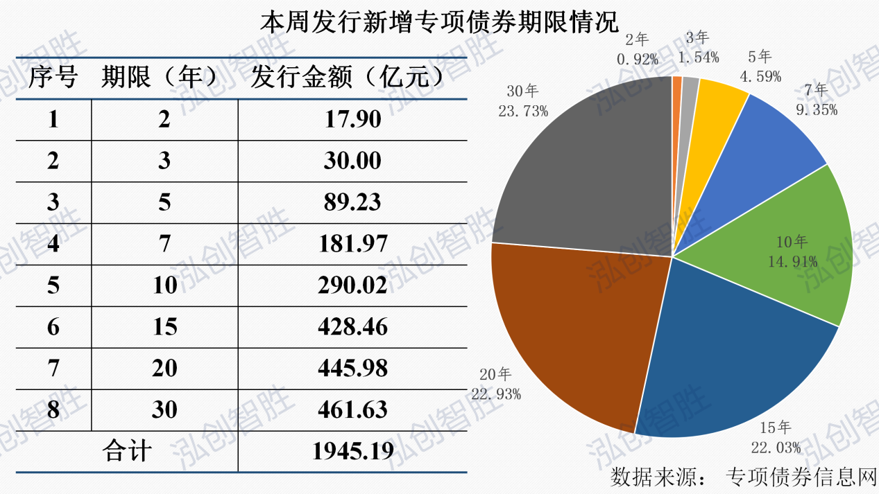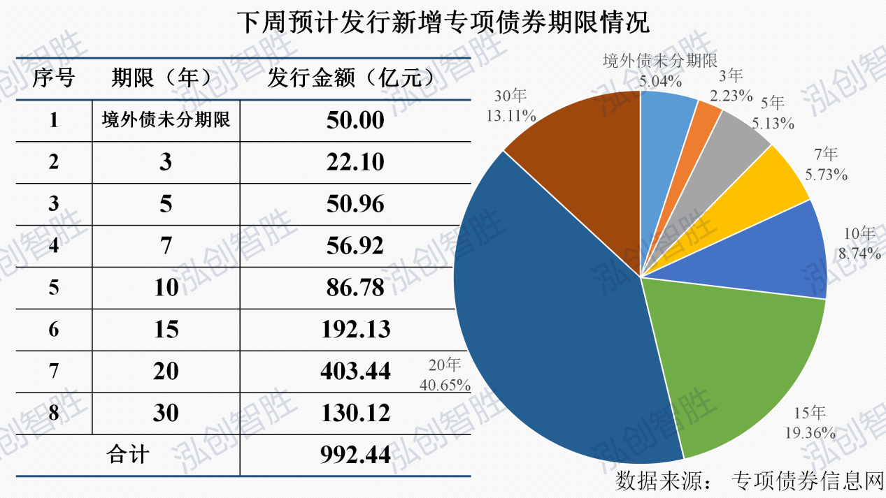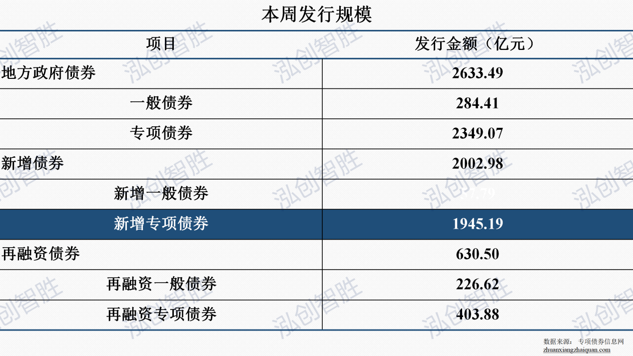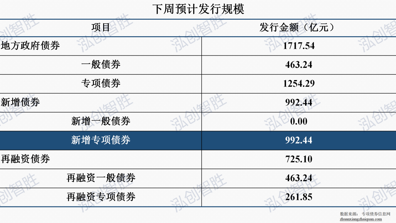 专项债券2349.07亿元,一般债券284.41亿元;新增债券2002.98亿元(其中专项债券1945.19亿元),再融资债券630.50亿元。本周共有16个地区(河南、山东、云南、福建、贵州、山西、新疆、安徽、甘肃、湖南、内蒙古、海南、宁夏、青岛、北京、吉林)发行111期地方政府债券,合计2633.49亿元。其中,新增专项债券95期,除宁夏外15个地区均有发行新增专项债券计划,合计发行额1945.19亿元。本周海南在香港簿记建档发行3期不超过50亿元离岸人民币地方政府债券,并在香港交易所挂牌上市,发行期限为2/3/5年期。本次是海南省首次在境外发行地方政府债券,2年期为蓝色债券,3年期和5年期为可持续发展债券,募集资金将投向海洋经济及海洋保护项目、绿色环保项目、医疗及住房等民生保障项目,进一步落实国家海洋发展战略,推进绿色低碳和可持续发展。本周地方政府债券平均期限为17.05年,其中新增专项债券平均期限17.45年。本周发行新增专项债券涉及八种期限类型,包括2年期、3年期、5年期、7年期、10年期、15年期、20年期、30年期,其中30年期占比最多,为23.73%,其次是20年期,占比22.93%,再次是15年期,占比22.03%。本周发行2期分年偿还新增专项债券,发行规模合计19.97亿元。其余均采取到期一次性还本,合计2633.52亿元。下周地方政府债券预计发行规模1717.54亿元,其中专项债券1254.29亿元,一般债券463.24亿元;新增债券992.44亿元(全部为新增专项债券),再融资债券725.10亿元。其中,河北发行一期再融资专项债券柜台债,商业银行柜合发行不超过5亿元。下周预计共有14个地区(云南、湖北、浙江、宁波、江西、内蒙古、深圳、陕西、河南、大连、青海、厦门、河北、广东)计划发行88期地方政府债券,其中,新增专项债券70期,涉及湖北、浙江、江西、深圳、陕西、大连、青海、厦门、广东等9个地区,合计发行额992.44亿元。深圳市计划于近期在香港簿记建档发行不超过50亿元离岸人民币地方政府债券,并将在香港联合交易所挂牌上市,发行期限为2/3/5年期。本次发行的地方政府债券中,3/5年期为绿色债券和蓝色债券,募集资金将投向轨道交通、水污染治理等项目,加快发展方式绿色转型,共建绿色粤港澳大湾区,推进绿色、循环、低碳发展。具体发行安排将及时公布。广东省政府计划近期在澳门特别行政区通过簿记建档方式发行离岸人民币地方政府债券20亿元(发行期限为3年期),届时将在澳门中央证券托管结算一人有限公司登记、托管及清算,并在中华(澳门)金融资产交易股份有限公司挂牌上市。本次发行募集资金将投向重大基础设施项目。具体发行安排将适时公布。下周预计发行地方政府债券平均期限为13.03年,其中新增专项债券平均期限17.45年(均不含未分2/3/5年期的50亿元境外债)。下周预计发行新增专项债券涉及八种期限类型,包括2年期、3年期、5年期、7年期、10年期、15年期、20年期、30年期,其中20年期占比最多,为40.65%,其次是15年期,占比19.36%,再次是15年期,占比13.11%。下周深圳、湖北计划发行13期分年偿还新增专项债券,发行规模合计267.16亿元。其余均采取到期一次性还本,合计1450.38亿元。20年期在第6-15年每年偿还债券本金的6%,第16-20年每年偿还债券本金的8%。附表1-2022年截至10月30日