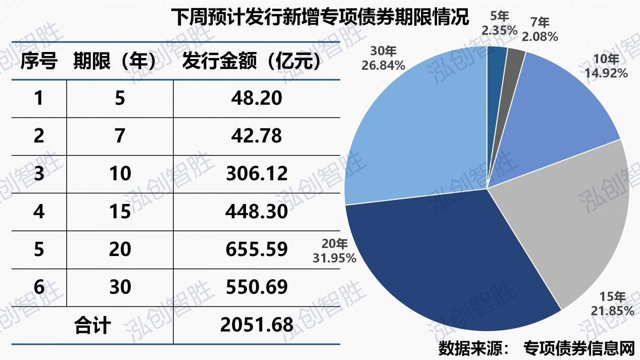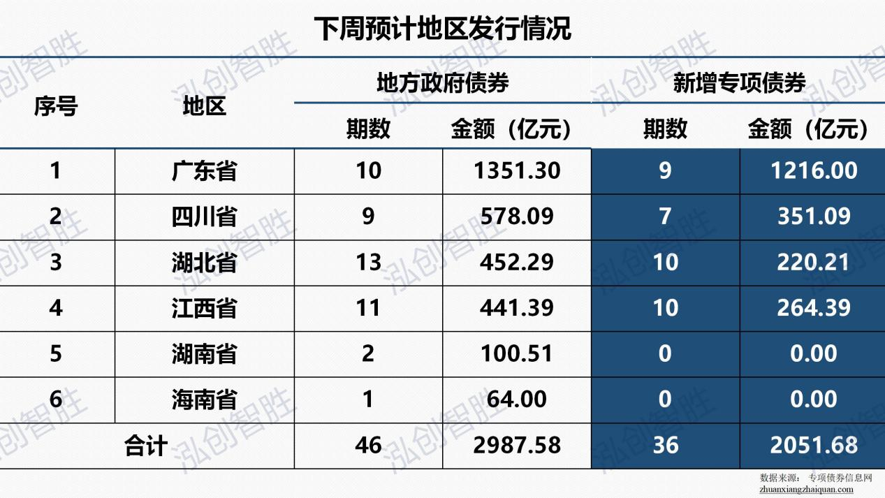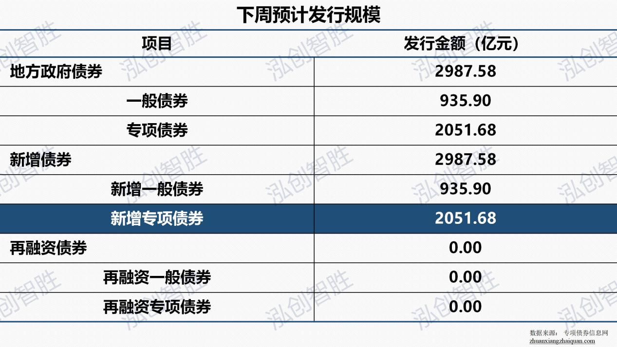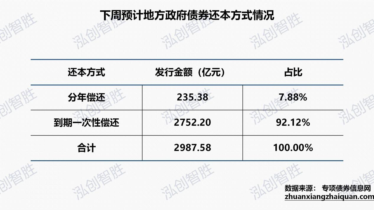 下周地方政府债券预计发行规模2987.58亿元,全部为新增债券。其中,新增专项债券2051.68亿元,新增一般债券935.90亿元。下周预计共有6个地区(广东、四川、湖北、江西、湖南、海南)计划发行46期地方政府债券。其中,新增专项债券36期,发行规模2051.68亿元。下周预计发行地方政府债券平均期限为16.49年,其中新增专项债券平均期限19.48年。下周预计发行新增专项债券涉及六种期限类型,包括5年期、7年期、10年期、15年期、20年期、30年期。其中,20年期发行655.59亿元,占比为31.95%;30年期发行550.69亿元,占比为26.84%;15年期发行448.30亿元,占比为21.85%。下周湖北、江西、四川分别计划发行5期、2期、1期分年偿还新增专项债券,发行规模合计235.38亿元。其余均采取到期一次性还本,合计2987.58亿元。15年期在第11-15年每年等额偿还本金的20%;20年期在第11-20年每年等额偿还本金的10%;