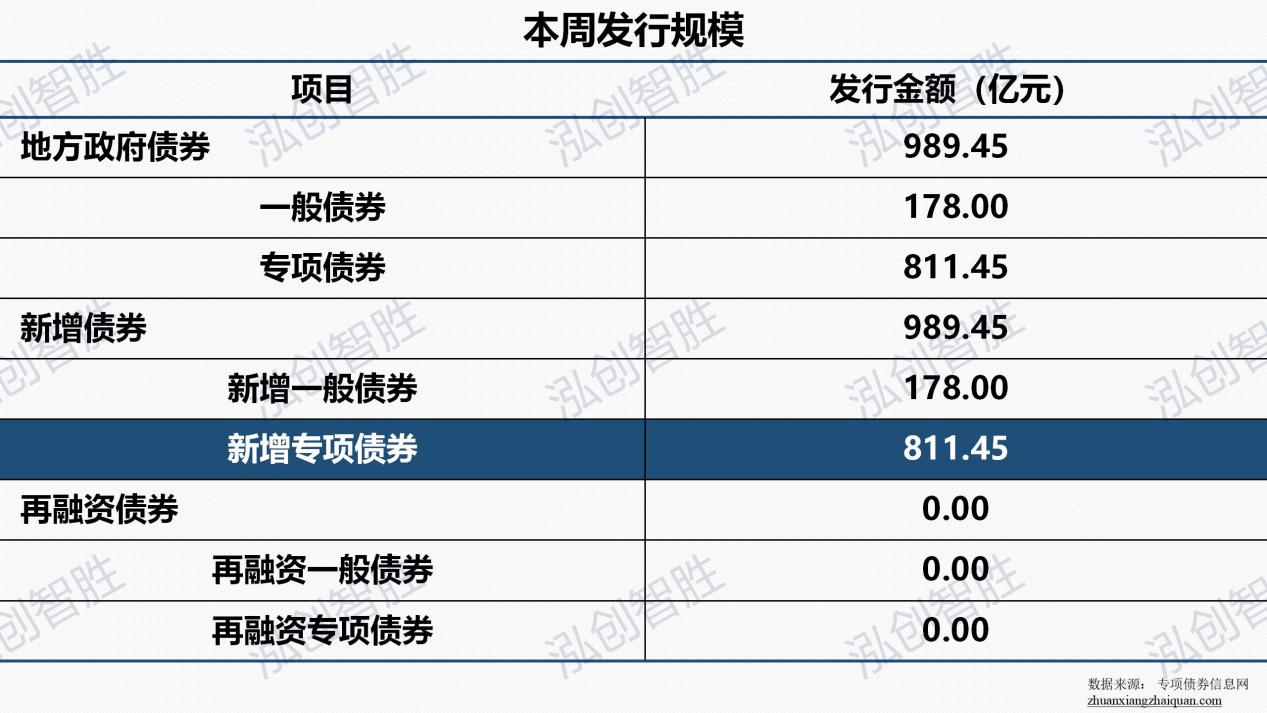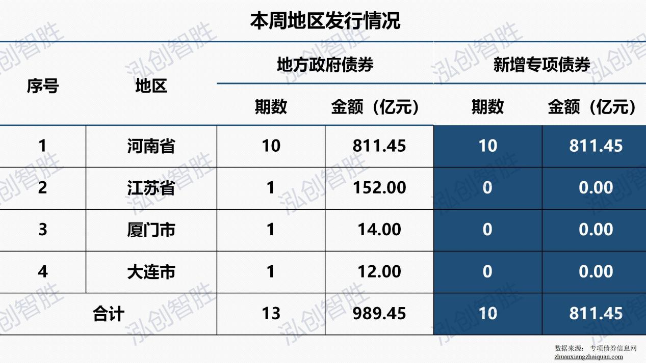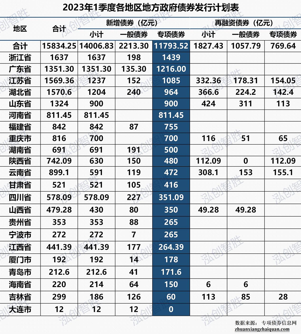 根据查询专项债券信息网数据可知,截至1月15日,2023年已有青岛、厦门、河南、大连、江苏5个发行主体成功发行24期地方政府债券,已发行规模为1202亿元。其中,新增专项债券983亿元,新增一般债券219亿元。截至1月15日,2023年地方政府债券已发行1202.05亿元,平均期限18.33年,平均利率3.09%;其中,新增专项债券已发行983.05亿元,平均期限20.22年,平均利率3.13%。根据查询专项债券信息网数据可知,截至1月15日,湖南、浙江、厦门、宁波、福建、贵州、江苏、海南、甘肃、陕西、重庆、云南、山西、山东、厦门、青岛、吉林、湖北、大连、河南、江西、广东、四川等23地陆续披露2023年1季度地方债发行计划或发行材料,拟发行规模至少15834.25亿元,其中,新增专项债券11793.52亿元。(青岛、大连、河南、江西、广东、四川仅公布1月发债计划。)浙江、广东、江苏计划发行新增专项债券均超千亿元,拟发行规模分别为1439亿元、1216亿元、1085亿元。湖北、山东、河南、福建、重庆、湖南计划发行新增专项债券规模在500亿元及以上。吉林计划发行新增专项债券最少,仅60亿元。(大连仅公布一般债发债计划)其他地区计划发行新增专项债券规模在100-500亿元之间。本周地方政府债券发行规模989.45亿元,全部为新增债券,其中,新增专项债券811.45亿元,新增一般债券178.00亿元。本周共有4个地区(河南、江苏、厦门、大连)成功发行13期地方政府债券,其中,河南发行新增专项债券10期,合计发行规模811.45亿元。