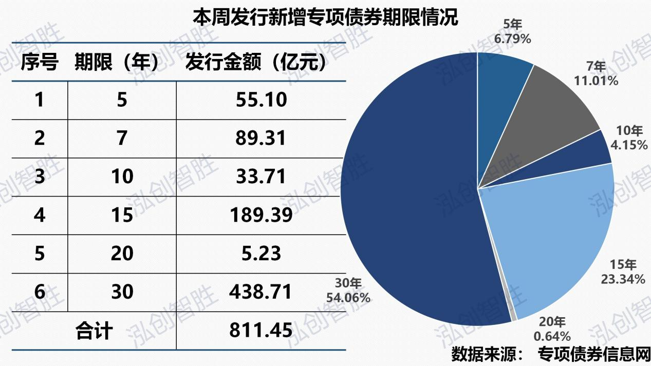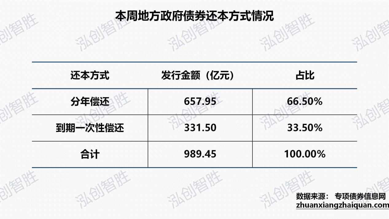 本周发行地方政府债券平均期限为19.29年,其中新增专项债券平均期限21.37年。本周发行新增专项债券涉及六种期限类型,包括5年期、7年期、10年期、15年期、20年期、30年期。其中,30年期发行438.71亿元,占比为54.06%;15年期发行189.39亿元,占比为23.34%。本周河南成功发行7期分年偿还新增专项债券,发行规模合计657.95亿元。其余均采取到期一次性还本,合计331.50亿元。其中,城乡发展和社会事业专项债券采取本金分期偿还方式,涉及偿还期限类型有4种:10年期在第4-6年每年偿还债券本金的12%,第7-10年每年偿还债券本金的16%;15年期在第6-10年每年偿还债券本金的5%,第11-15年每年偿还债券本金的15%;20年期在第6-10年每年偿还债券本金的3%,第11-15年每年偿还债券本金的5%,第16-20年每年偿还债券本金的12%;30年期在第6-10年每年偿还债券本金的1%,第11-20年每年偿还债券本金的2%,第21-25年每年偿还债券本金的5%,第26-30年每年偿还债券本金的10%。除城乡发展和社会事业专项债券外,剩余各期债券到期一次偿还本金并支付最后一次利息。