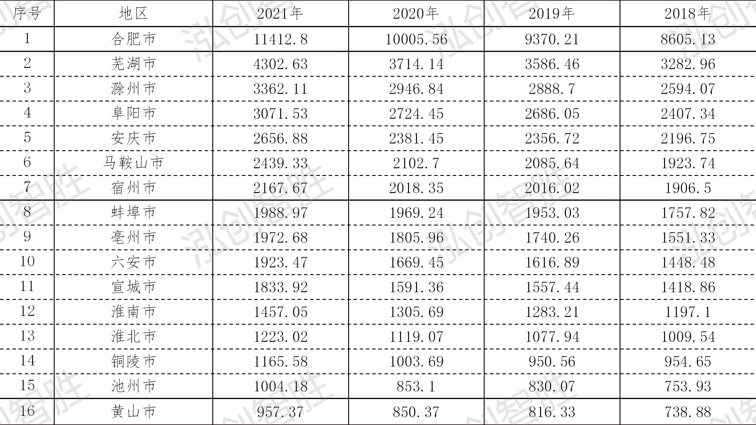 数据来源:安徽省统计年鉴、北京泓创智胜咨询有限公司整理(二)安徽省各地市2018-2021年GDP