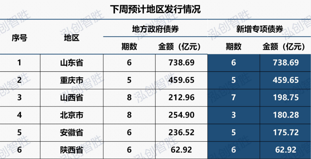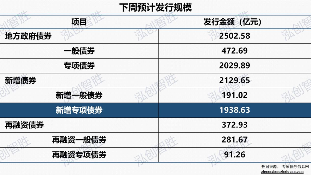 下周地方政府债券预计发行规模2502.58亿元,其中专项债券2029.89亿元,一般债券472.69亿元;新增债券2129.65亿元(含专项债券1938.63亿元),再融资债券372.93亿元。下周预计共有11个地区(山东、重庆、山西、北京、安徽、陕西、湖北、海南、天津、河北、大连)计划发行59期地方政府债券。其中,新增专项债券43期,发行规模1938.63亿元。
