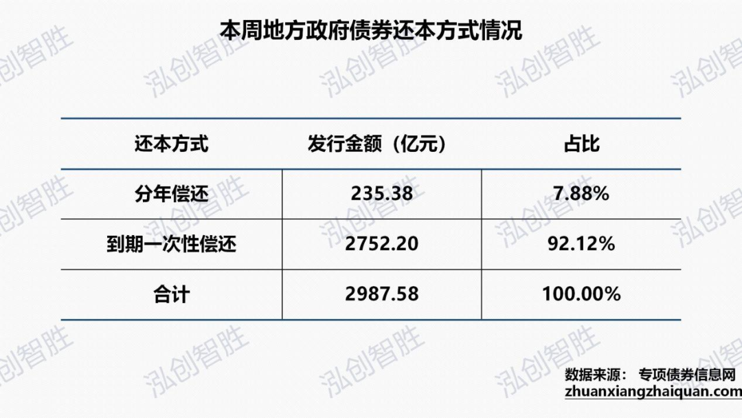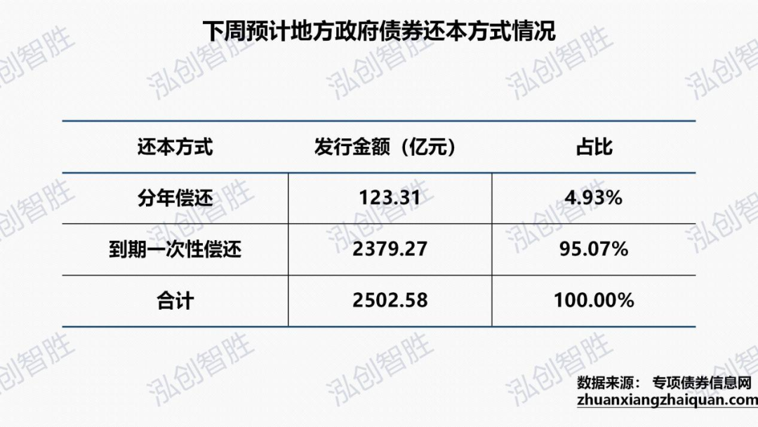 下周天津、山西、湖北分别计划发行3期、1期、4期分年偿还新增专项债券,发行规模合计123.31亿元。其余均采取到期一次性还本,合计2379.27亿元。15年期在第11-15年每年等额偿还本金的20%;20年期在第11-20年每年等额偿还本金的10%;