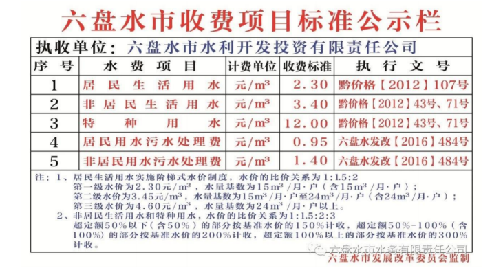 集镇和农村人畜饮水收入:单价结合六盘水市公示的居民生活用水收费项目及贵州省物价局《关于调整六盘水市中心城区居民生活用水阶梯式水价的批复》(黔价格〔2012)107号)进行预测。经与项目单位沟通,结合本项目具体情况,根据谨慎性原则,本项目集镇和农村人畜饮水收费标准拟定为2.00元/立方米。