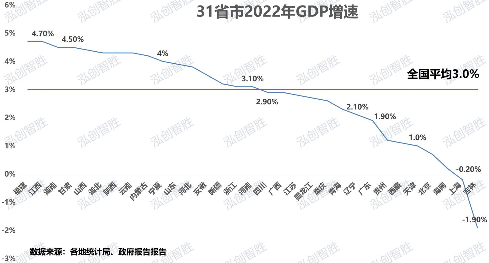 2022年,大部分地区经济增速位于2%-5%之间,其中16个地区GDP增速超过全国水平。福建、江西并列第一,以4.7%的GDP增速领跑全国。GDP增速超过4%(含4%)的地区有10个,分别是福建(4.7%)、江西(4.7%)、湖南(4.5%)、甘肃(4.5%)、山西(4.4%)、湖北(4.3%)、陕西(4.3%)、云南(4.3%)、内蒙古(4.2%)、宁夏(4%)。经济总量排名前十的仅有福建、湖南、湖北3个地区GDP增速超过了4%。同时,福建也是GDP增速前十里唯一一个东部沿海省市,其余均为中西部省市。仅上海、吉林2022年GDP增速为负,分别为-0.2%、-1.9%。