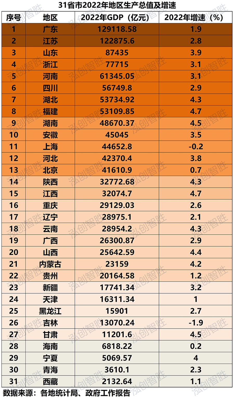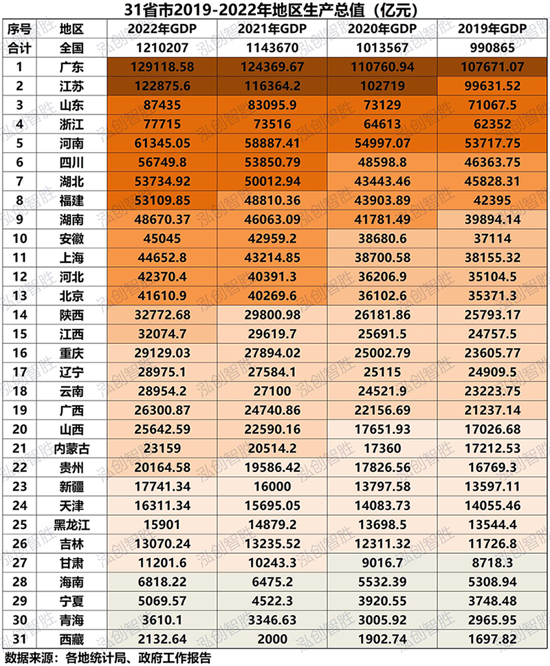 1月18日,国家统计局公布2022年全年国内生产总值初步核算结果,2022全年我国GDP为1210207亿元,按不变价格计算,比上年增长3.0%。1月21日,河南发布2022年经济运行情况,至此31省市2022年全年GDP数据全部出炉。(后附2019-2022年31省市地区生产总值表)经济总量方面,广东、江苏、山东继续稳坐“前三把交椅”,安徽首进前十。经济增速方面,16省市跑赢“全国线”,福建、江西增速并列第一,均为4.7%。