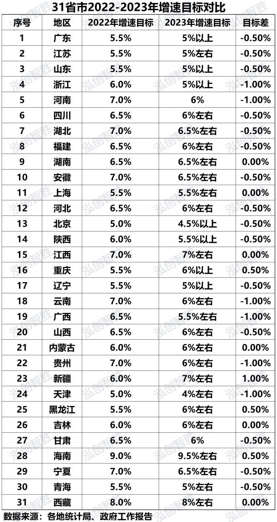 各省市2023年GDP增速预期目标均在4%-9.5%之间,且集中在5%-6.5%之间。