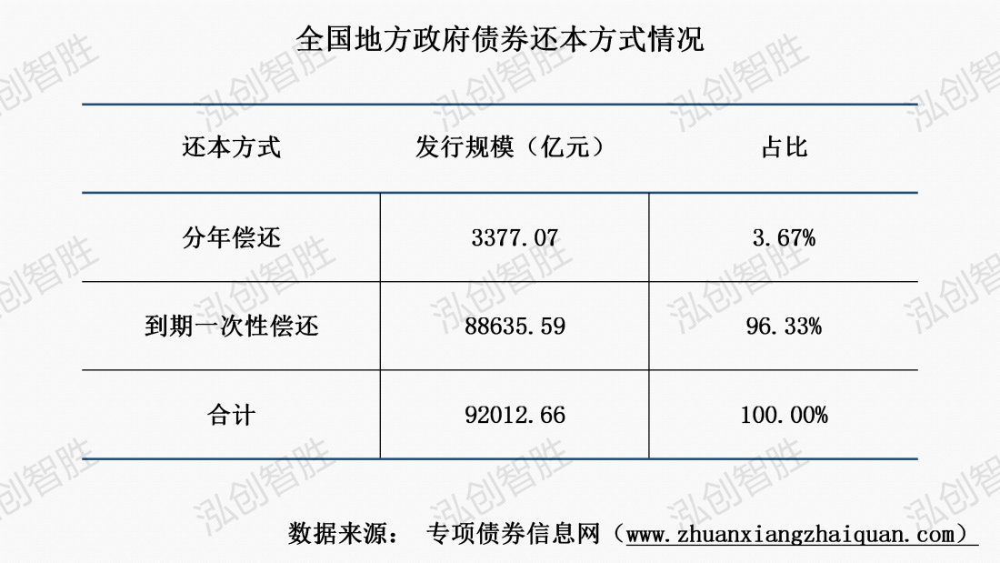 截至11月9日,全国已发行2048期地方政府债券,发行规模合计92012.66亿元,其中,167期债券采取分年还本,涉及金额3377.07亿元,占总发行规模的3.67%;其他期债券均采取到期一次性还本。
