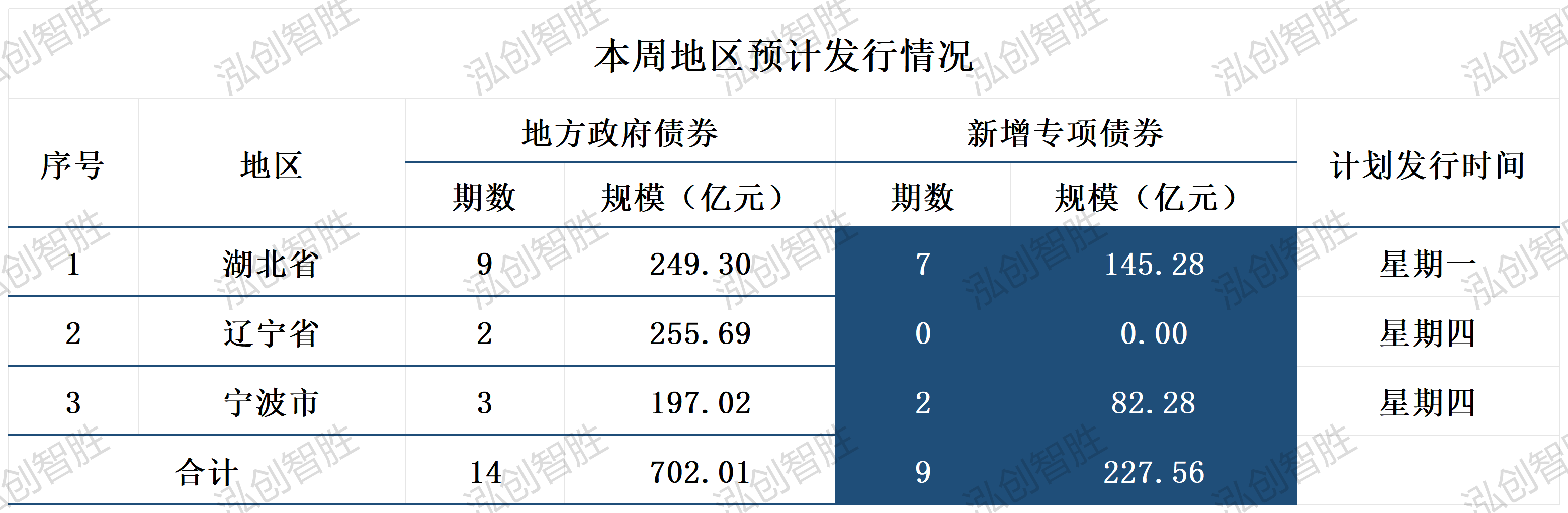 本周共有湖北省、辽宁省等3个地区计划发行14期地方政府债券,发行规模702.01亿元;其中,新增专项债券计划发行9期地方政府债券,发行规模227.56亿元。
