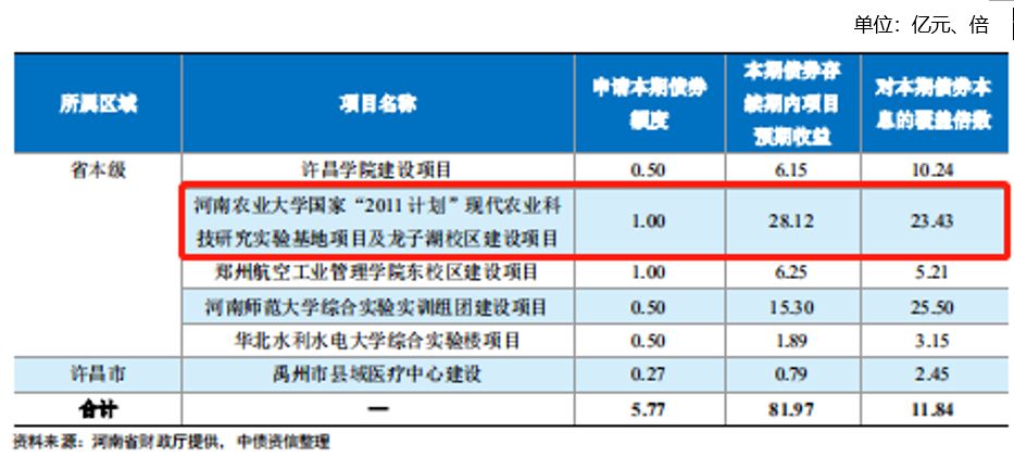 河南农业大学国家“2011计划”现代农业科技研究实验基地项目及龙子湖校区建设总投资146041万元,其中资本金136041万元,占总投资的93%。拟申请政府专项债券资金10000万元,占总投资的7%。2020 年拟申请专项债券资金10000万元,债券期限为5年。