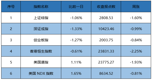 1. 国内股市:上证指数收盘跌1.06%报2808.53点;深证成指跌1.33%报10423.46点;创业板指跌1.27%报2003.75点;恒生指数震荡收跌0.61%,报23831.33点。本周,上证指数跌逾1%,结束此前两周连升;深证成指跌0.99%,创业板指跌0.84%,结束此前三周连升,恒生指数跌2.25%。北向资金净流入32.49亿元,本周北向资金累计净流入24.16亿元。