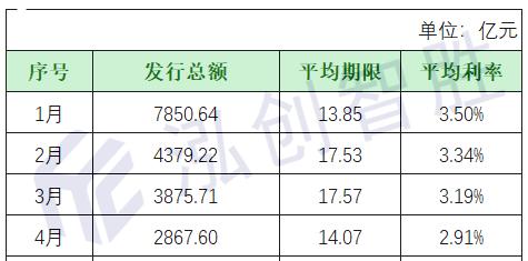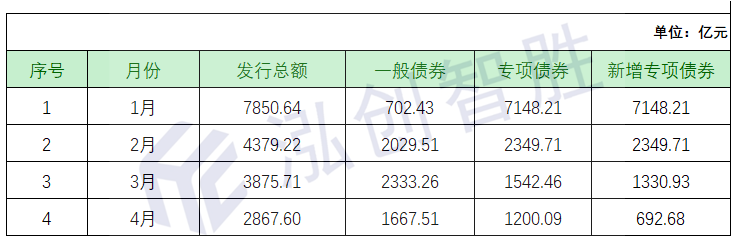 1.4月,全国地方政府债券发行规模2867.6亿元,专项债券1200.09亿元,一般债券1667.51亿元。受额度影响,1-4月发行规模呈逐步下降趋势,发行情况如下: