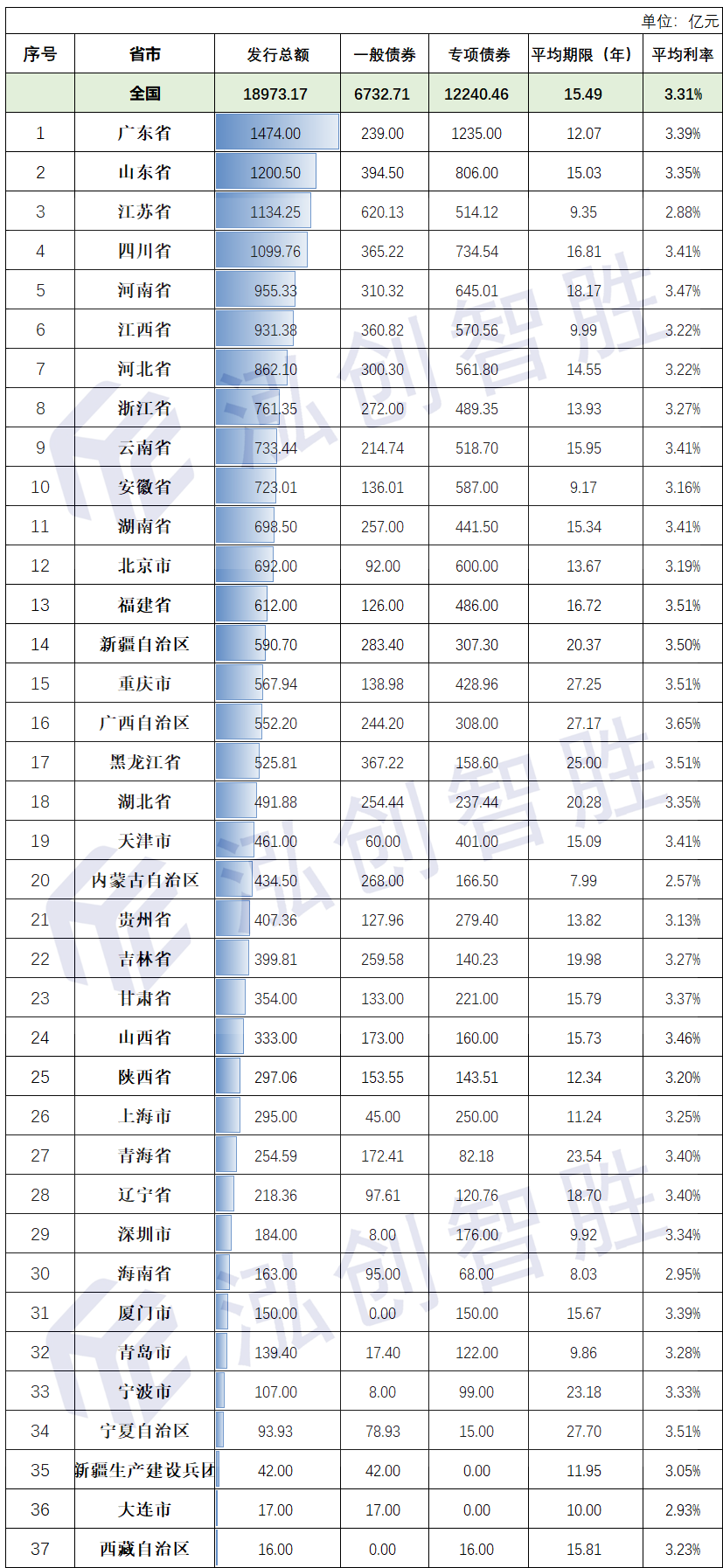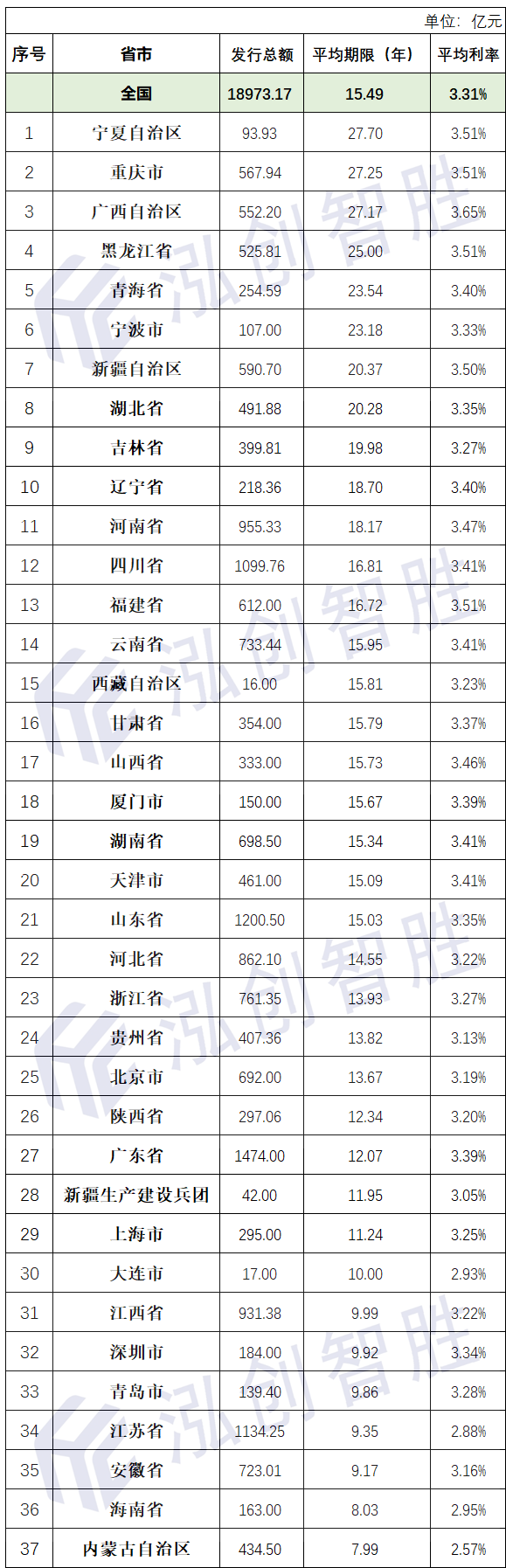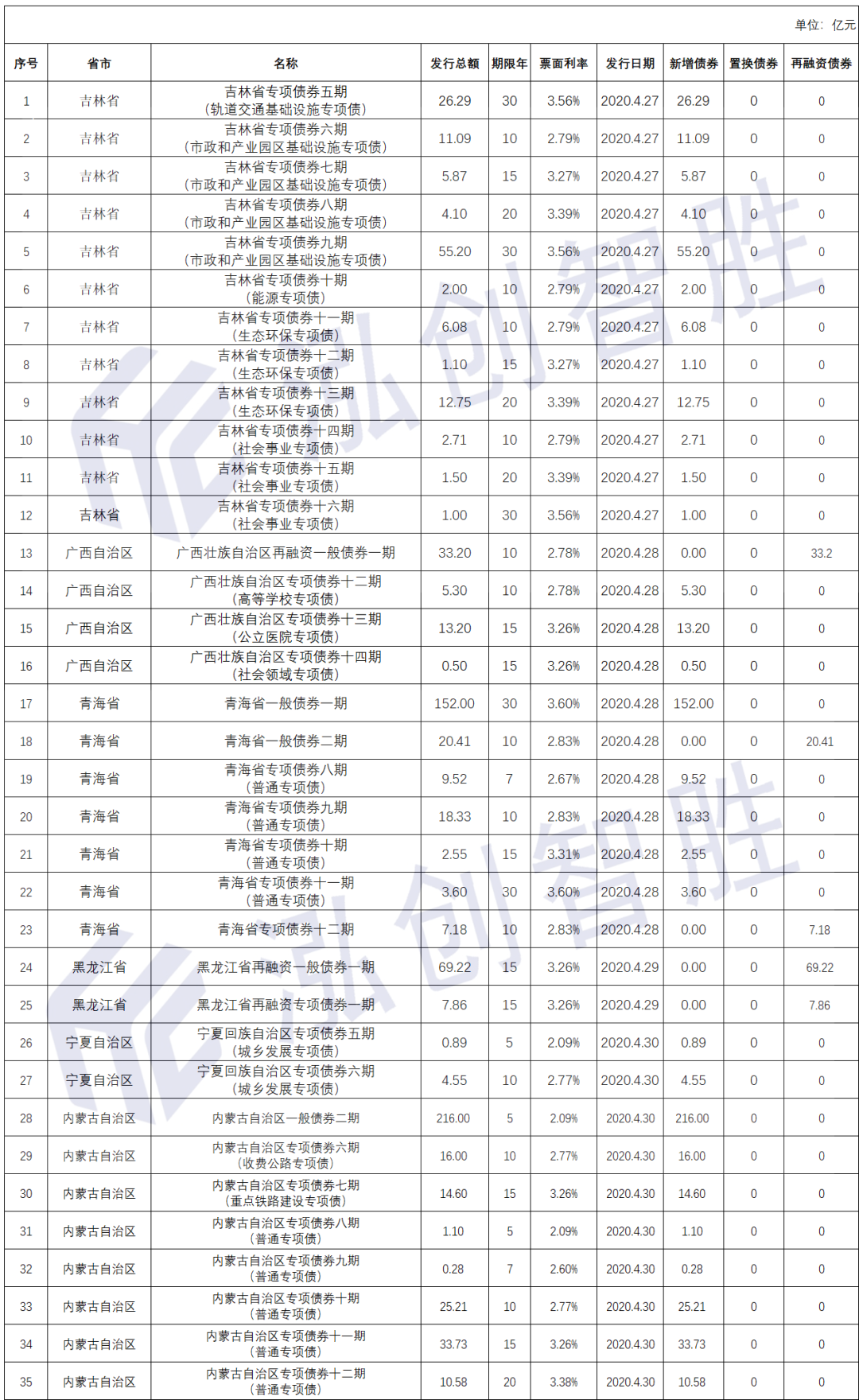 从各省平均发行期限和利率看,平均发行期限最长为:宁夏自治区27.7年,平均发行期限最短为:内蒙古自治区7.99年;平均发行利率最高为:广西自治区3.65%,平均发行利率最低为:内蒙古自治区2.57%。 (详情见:表1-2020年5月3日全国各省市地方债发行情况汇总表)
