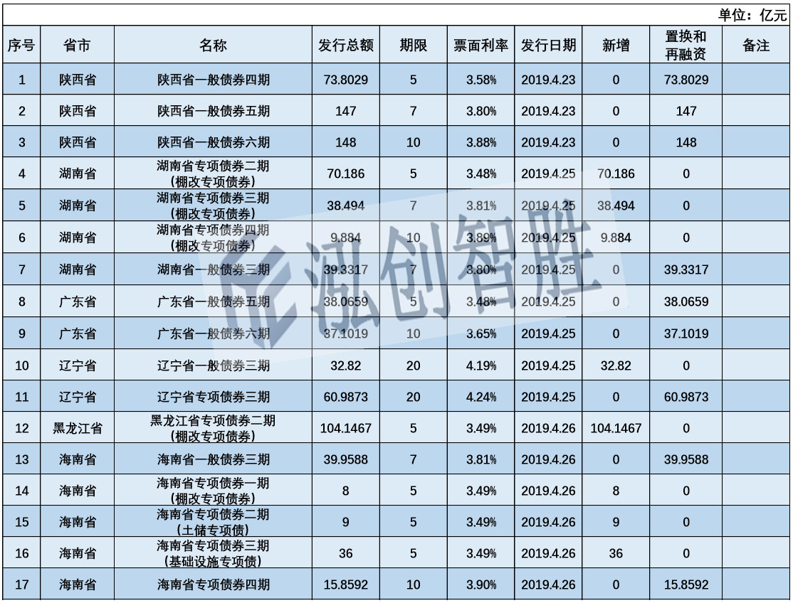 3、上周,陕西省、湖南省、广东省、辽宁省、黑龙江省、海南省共新发行了17只地方政府债券,共计规模908.6384亿元。