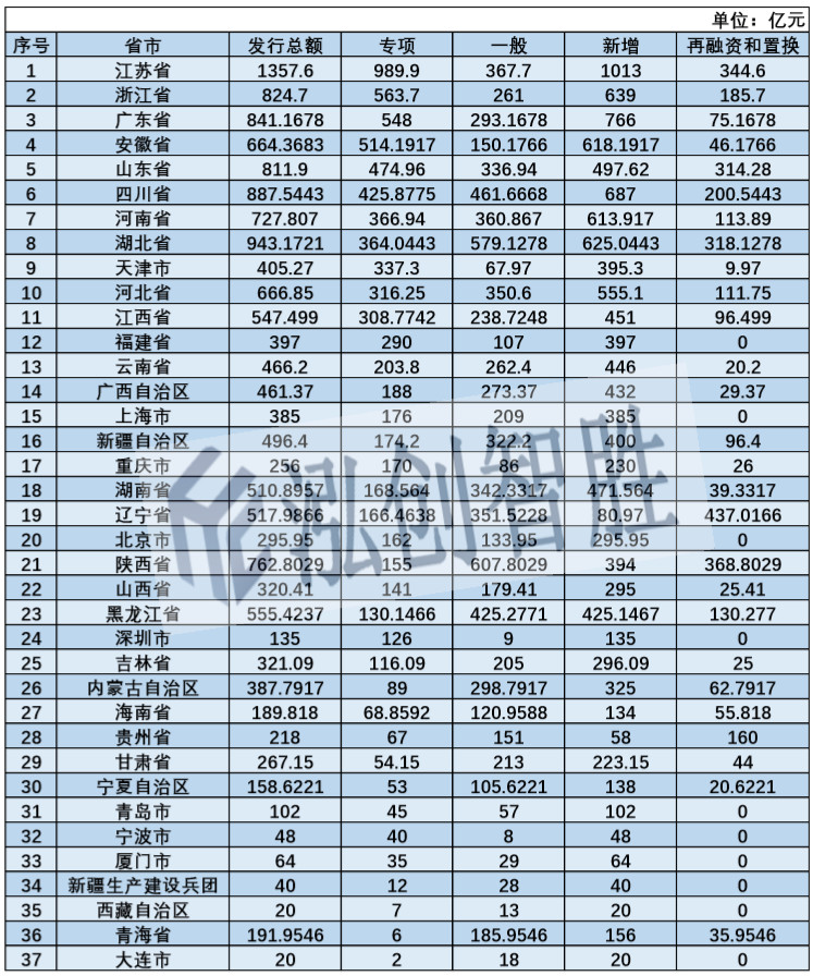 其中,江苏、浙江和广东发行专项债券规模位居前三,分别为989.9亿元、563.7亿元和548亿元,安徽、山东、四川、河南、湖北等省份紧随其后。
