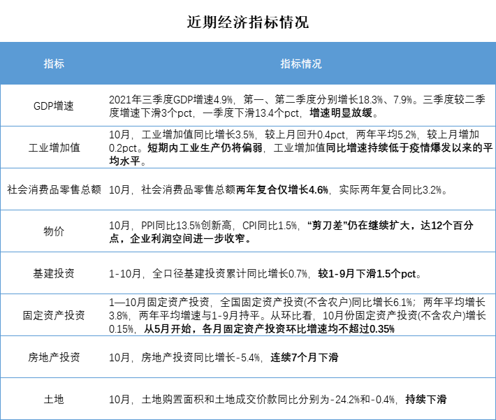 2022年新增专项债券额度有多少?笔者试图根据当前的经济情况、宏观政策及2022年地方债到期情况进行分析,预判2022年额度情况。从各项指标来看,近期经济增速明显放缓,投资增速放缓,延续低速增长,生产偏弱,基建待发力,消费一定程度恢复但仍疲软,PPI与CPI剪刀差进一步加大,企业利润空间收窄,经济面临下行压力。2. 保持经济平稳运行的难度加大,明年经济下行压力或许将更大2021年11月18日的经济形势专家和企业家座谈会上亦提出“我国经济出现新的下行压力,要在高基数上继续保持平稳运行面临很多挑战”。2021年11月19日,央行发布2021年3季度货币政策执行对经济形势的表述由二季度的“国内经济恢复仍然不稳固、不均衡”调整为“国内经济恢复发展面临一些阶段性、结构性、周期性因素制约,保持经济平稳运行的难度加大”。2021年11月24日,国务院常务会议指出面对新的经济下行压力,要加强跨周期调节。多个经济数据和政策会议可以看出当前经济面临新的下行压力,下行压力在增大,周期性因素成分更重。与此同时。新发现的变异毒株Omicron的出现,可能导致疫情进一步蔓延,一些国家采取封锁边境、航空限制等防疫举措,限制全球经济复苏和发展,加之我国外部环境不断复杂,明年经济下行压力或许将更大。当前经济下行压力加大,预计明年经济下行压力或许将更大,需要政策层面更精准的呵护。那明年国家宏观政策会怎么安排?我们试图从中央工作会议、国务院常务会议及近期的财政政策、货币政策来预判明年的宏观政策。