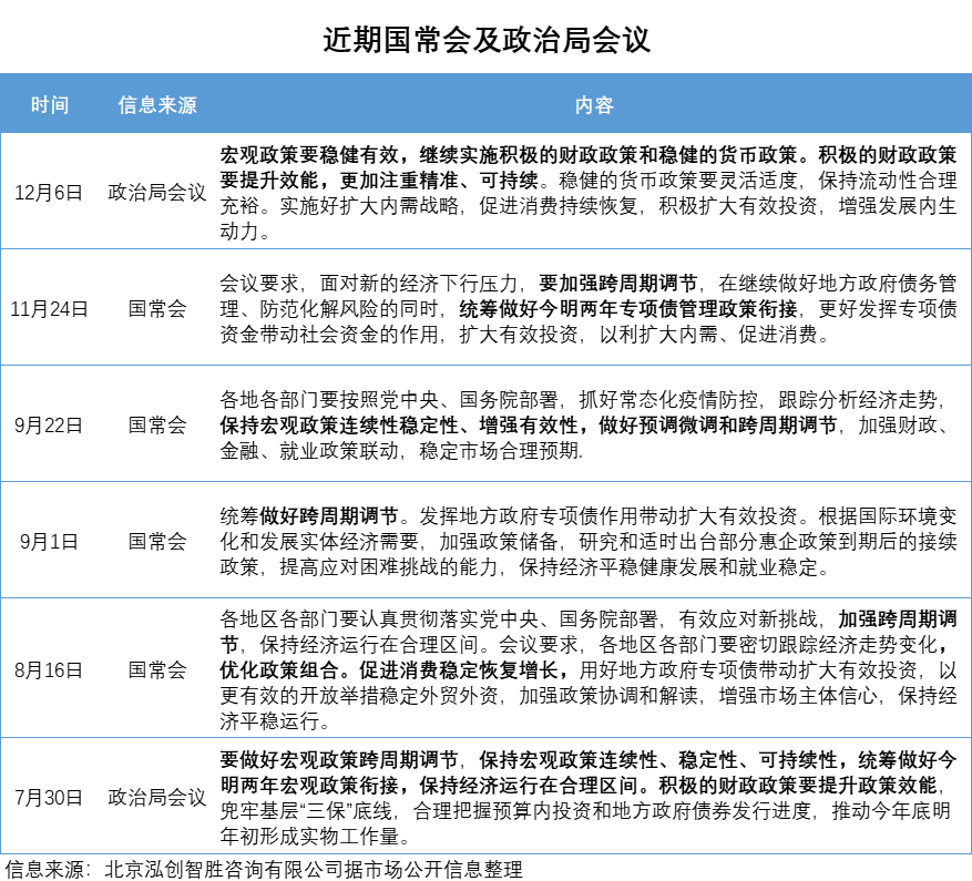 11月24日国务院常务会议要求统筹考虑各地实际和促进区域协调发展要求,合理提出明年专项债额度和分配方案,加强重点领域建设,不“撒胡椒面”,研究依法依规按程序提前下达部分额度。12月6日政治局会议指出明年经济工作要稳字当头、稳中求进。宏观政策要稳健有效,继续实施积极的财政政策和稳健的货币政策。积极的财政政策要提升效能,更加注重精准、可持续。