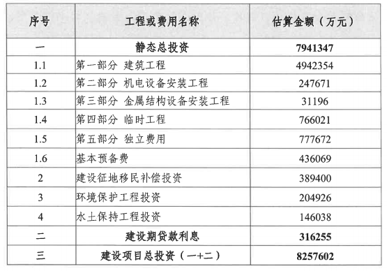 根据水利部批复的项目初步设计报告,本项目总投资为825.76亿元,其中批复静态投资794.13亿元,投资构成如下: