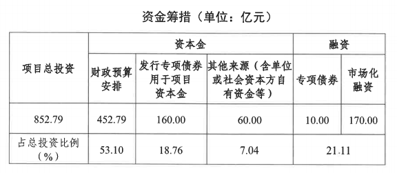 本项目资本金包括地方水利建设基金、中央预算内补助、地方财政预算资金、专项债用于资本金部分、单位自有资金。计划发行专项债券170.00亿元,其中160.00亿元作为项目资本金;计划进行市场化融资170.00亿元,已获得10家银行贷款授信。资金筹措情况如下: