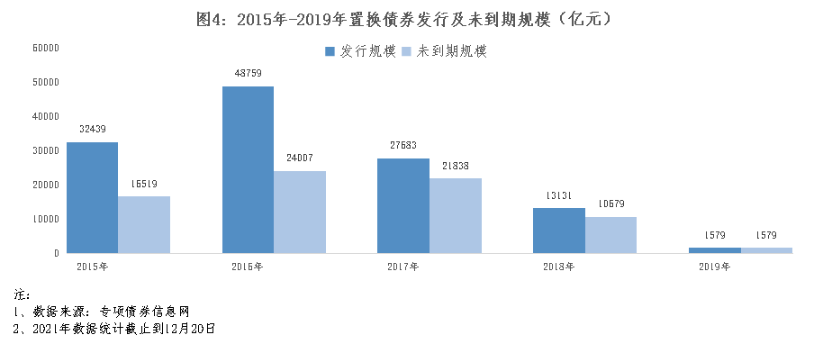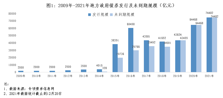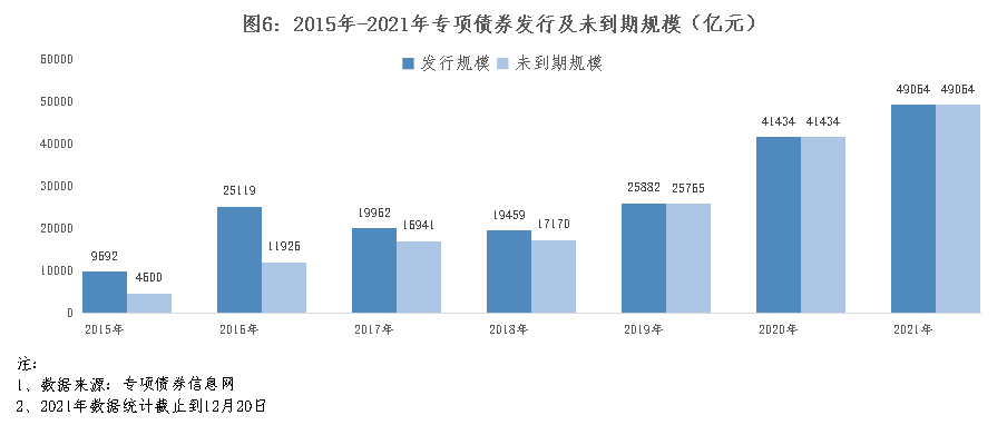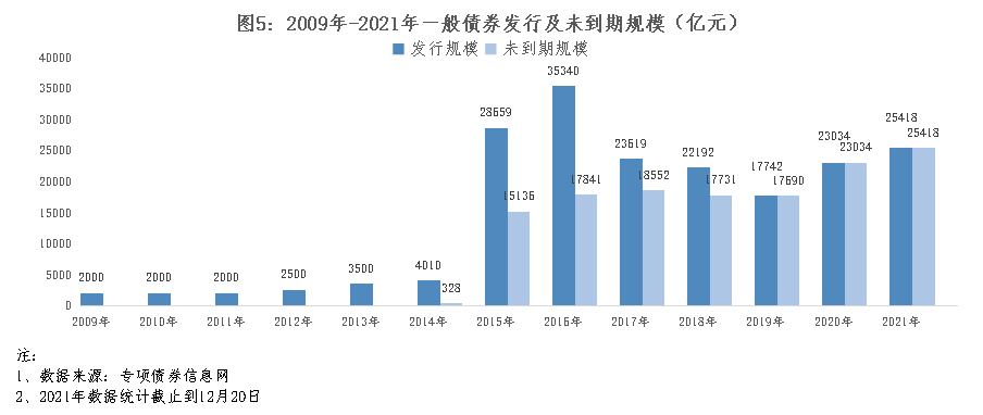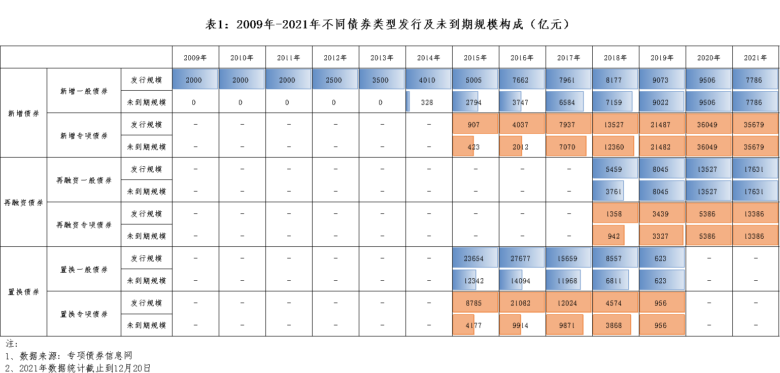 2009年-2013年分别发行地方政府债券2000亿元、2000亿元、2000亿元、2500亿元、3500亿元,已全部到期偿还。2014年发行4010亿元,未到期规模328亿元,占比8.17%2015年发行38351亿元,未到期规模19736亿元,占比51.46%;2016年发行60458亿元,未到期规模29766亿元,占比49.23%;2017年发行43581亿元,未到期规模35492亿元,占比81.44%;2018年发行41652亿元,未到期规模34901亿元,占比83.79%;2019年发行43624亿元,未到期规模43455亿元,占比99.61%;2020年、2021年分别发行64468亿元、74482亿元,全部未到期。2018年财政部首次提出再融资债券,用于偿还部分到期地方政府债券本金。2018年起,全国开始发行再融资债券。2019年9月4日,国务院常务会议确定,专项债资金不得用于土地储备和房地产相关领域、置换债务以及可完全商业化运作的产业项目。2020年起,全国不再发行置换债券。2009年-2013年分别发行新增债券2000亿元、2000亿元、2000亿元、2500亿元、3500亿元,已全部到期偿还。2014年发行新增债券4010亿元,未到期规模328亿元,占比8.17%;2015年发行新增债券5912亿元,未到期规模3217亿元,占比54.42%;2016年发行新增债券11699亿元,未到期规模5759亿元,占比49.22%;2017年发行新增债券15898亿元,未到期规模13654亿元,占比85.89%;2018年发行新增债券21705亿元,未到期规模19519亿元,占比89.93%;2019年发行新增债券30561亿元,未到期规模30504亿元,占比99.81%;2020年、2021年分别发行新增债券45555亿元、43465亿元,全部未到期。2018年发行再融资债券6817亿元,未到期规模4703亿元,占比68.99%;2019年发行再融资债券11484亿元,未到期规模11372亿元,占比99.02%;2020年、2021年分别发行再融资债券18913亿元、31017亿元,全部未到期。2015年发行置换债券32439亿元,未到期规模16519亿元,占比50.92%;2016年发行置换债券48759亿元,未到期规模24007亿元,占比49.24%;2017年发行置换债券27683亿元,未到期规模21838亿元,占比78.89%;2018年发行置换债券13131亿元,未到期规模10679亿元,占比81.33%;2009年-2013年分别发行一般债券2000亿元、2000亿元、2000亿元、2500亿元、3500亿元,已全部到期偿还。2014年发行一般债券4010亿元,未到期规模328亿元,占比8.17%;2015年发行一般债券28659亿元,未到期规模15136亿元,占比52.81%;2016年发行一般债券35340亿元,未到期规模17841亿元,占比50.48%;2017年发行一般债券23619亿元,未到期规模18552亿元,占比78.54%;2018年发行一般债券22192亿元,未到期规模17731亿元,占比79.90%;2019年发行一般债券17742亿元,未到期规模17690亿元,占比99.71%;2020年、2021年分别发行一般债券23034亿元、25418亿元,全部未到期。2015年发行专项债券9692亿元,未到期规模46006亿元,占比47.46%;2016年发行专项债券25119亿元,未到期规模11926亿元,占比47.48%;2017年发行专项债券19962亿元,未到期规模16941亿元,占比84.87%;2018年发行专项债券19459亿元,未到期规模17170亿元,占比88.23%;2019年发行专项债券25882亿元,未到期规模25765亿元,占比99.55%;2020年、2021年分别发行专项债券41434亿元、49064亿元,全部未到期。