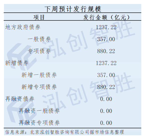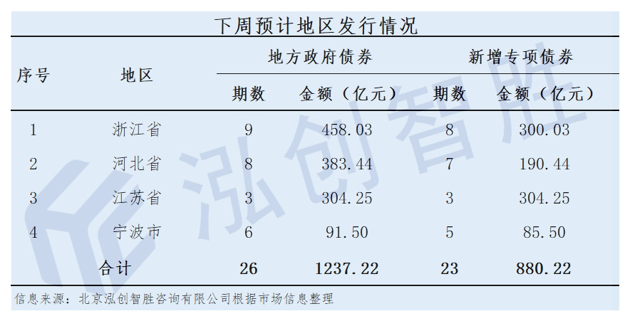 下周预计有4个地区(浙江、河北、江苏、宁波)计划发行地方政府债券,共26期,规模为1237.22亿元;