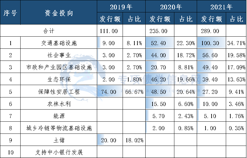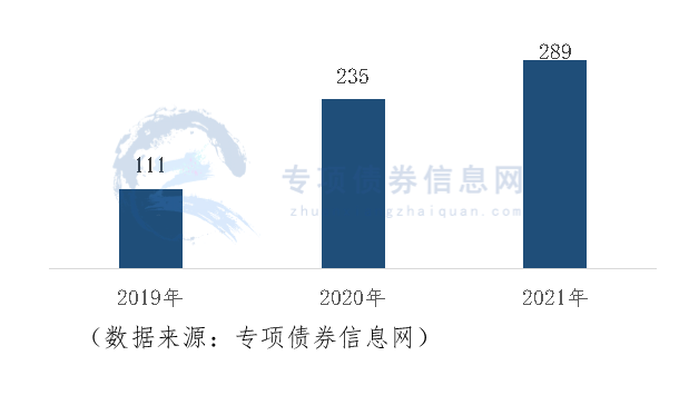 宁波市2019-2021年新增专项债券累计发行635亿元,年均增长率37.57%,其中,2019年发行111亿元,2020年发行235亿元,2021年发行289亿元。图1:宁波市2019-2021年新增专项债券发行情况(亿元)