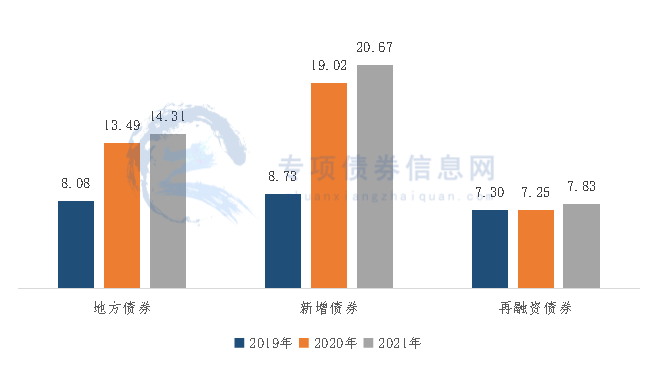 宁波市2019-2021年地方政府债券平均发行期限逐年延长,2020年同比延长5.41年,2021年同比延长0.82年,主要是因为新增债券期限延长。图2:宁波市2019-2021年地方政府债券平均发行期限对比(年)