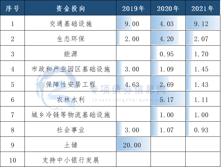 2021年宁波市新增专项债券发行项目涵盖市政和产业园区基础设施、社会事业、交通基础设施、保障性安居工程、农林水利、生态环保、城乡冷链等物流基础设施、能源等领域,应用领域广,项目类型多。其中,发行规模前三分别为交通基础设施、社会事业、市政和产业园区基础设施,金额分别为100.3亿元、56.6亿元、49.4亿元。表2:宁波市2019-2021年新增专项债券资金投向规模(亿元)