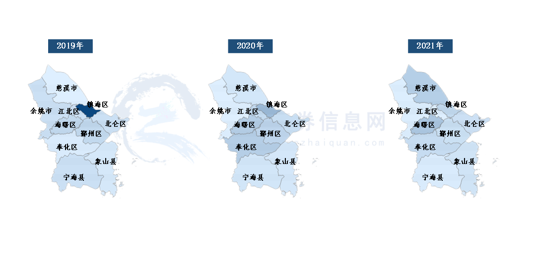 图5:宁波市2019-2021年各区县新增专项债券发行分布图