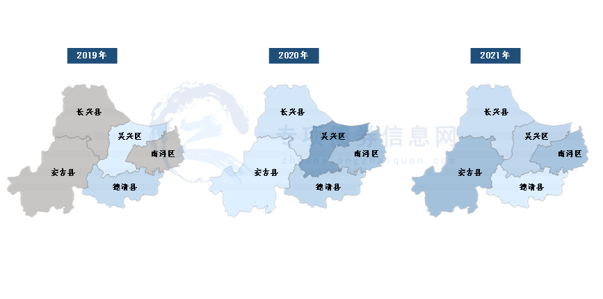 图4:湖州市2019-2021年各区县新增专项债券发行分布图
