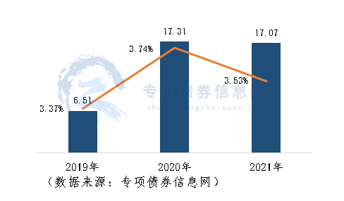 湖州市2019-2021年新增专项债券平均发行利率分别为3.37%、3.74%、3.53%,其中,2020年同比上升37BP。