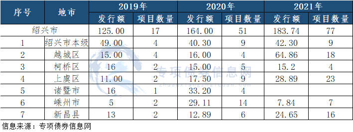 表3:绍兴市2019-2021年各区县新增专项债券发行情况(亿元、个)