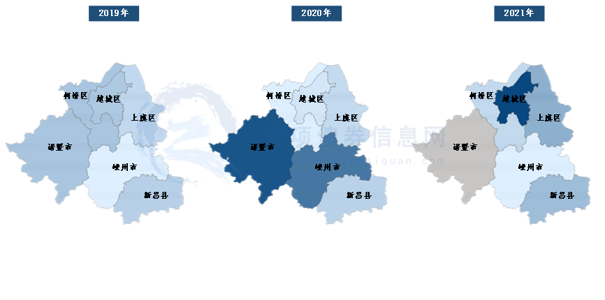 图4:绍兴市2019-2021年各区县新增专项债券发行分布图