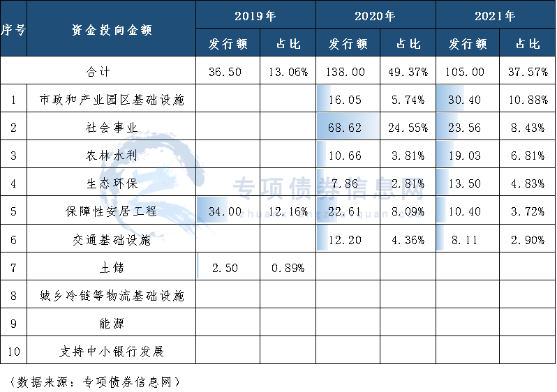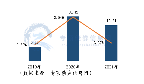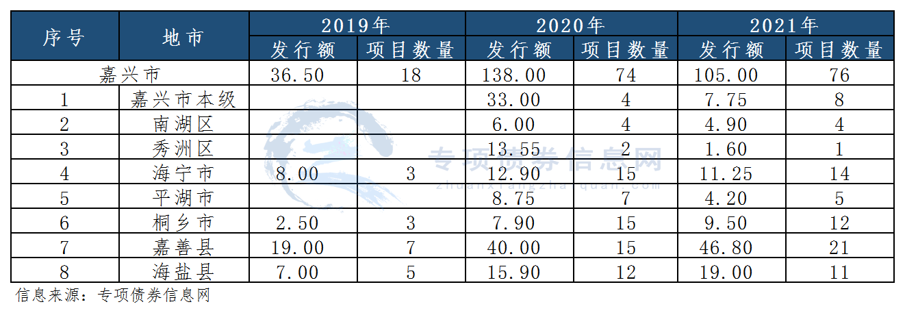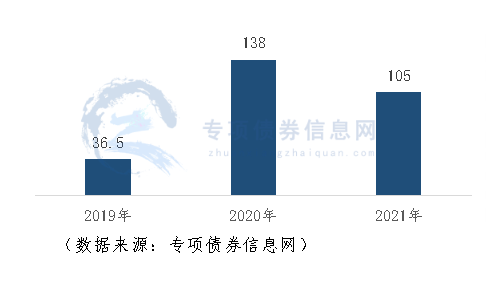 嘉兴市2019-2021年新增专项债券累计发行279.5亿元,年均增长率42.22%,其中,2019年发行36.5亿元,2020年发行138亿元,2021年发行105亿元。