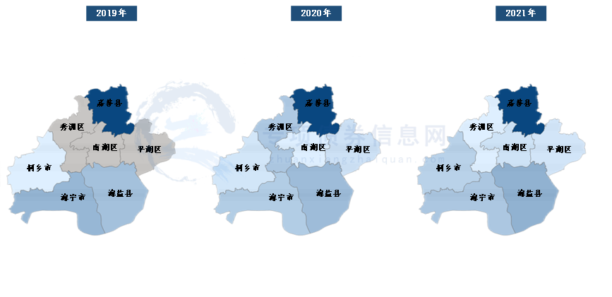 图4:嘉兴市2019-2021年各区县新增专项债券发行分布图