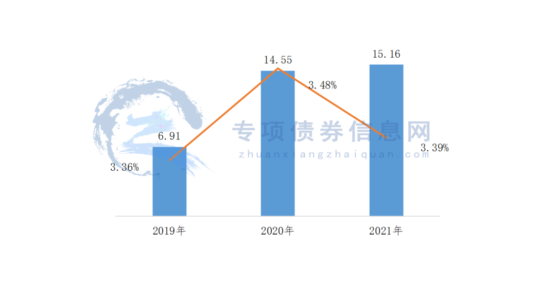 2、2019-2021年浙江省新增专项债券期限利率2019年浙江省新增专项债券平均发行期限6.91年,平均发行利率3.36%;2020年浙江省新增专项债券平均发行期限14.55年,平均发行利率3.45%;2021年浙江省新增专项债券平均发行期限15.16年,平均发行利率3.39%。图7:2019-2021年浙江省新增专项债券期限利率情况图8:2019-2021年浙江省及全国新增专项债券平均发行期限(年)