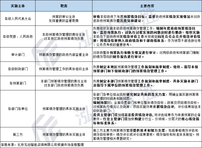 全面实施预算绩效管理是一项长期的系统性工程,涉及面广、难度大,需要各级政府、各部门以及社会力量的共同参与,实施主体主要包括:各级人民代表大会,各级党委、人民政府,各级部门各单位,第三方专业咨询机构、科研院所、高等院校、专家等。