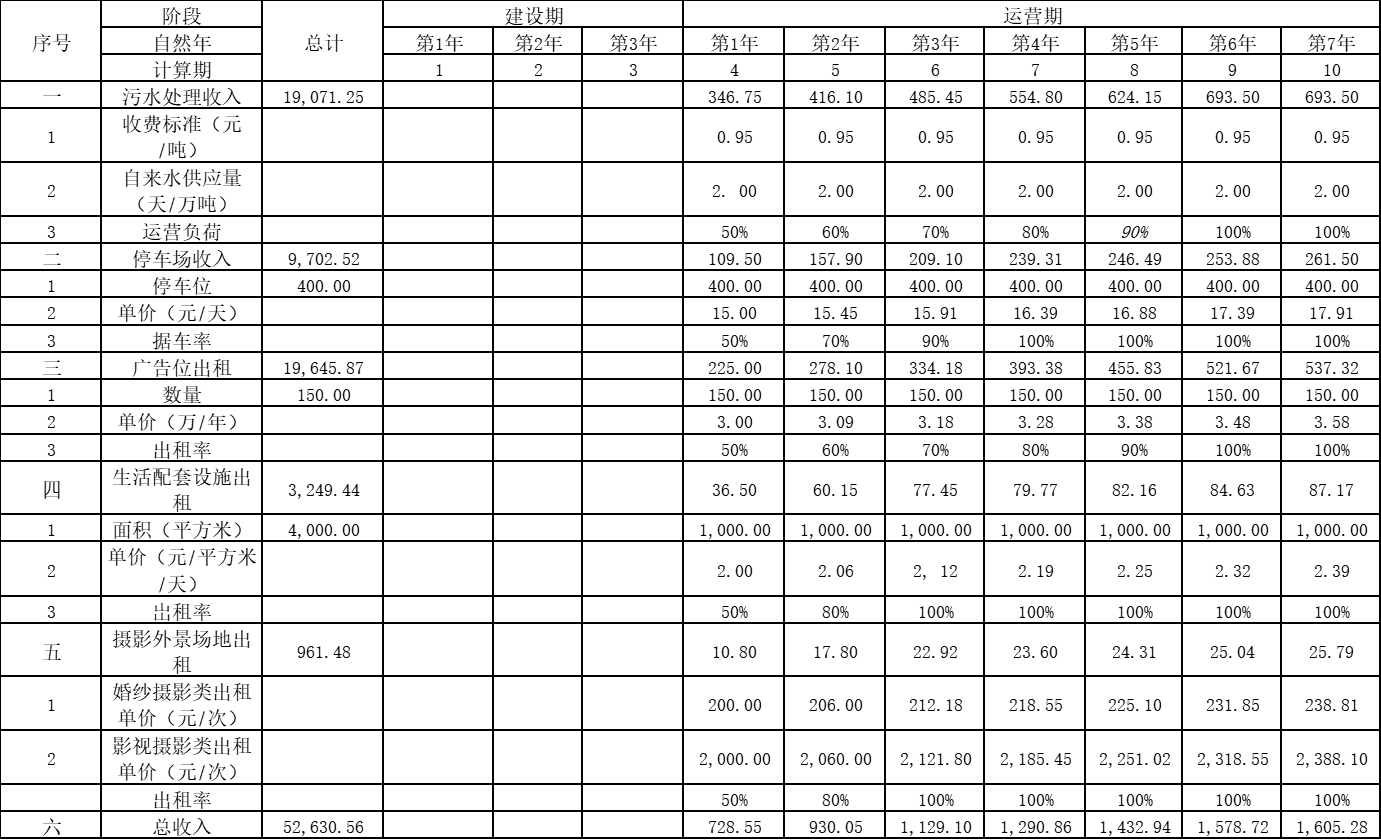 该项目收入来源为污水处理收入、停车位收入、路边广告位出租、生活配套设施出租以及摄影外景场地出租的收入等。