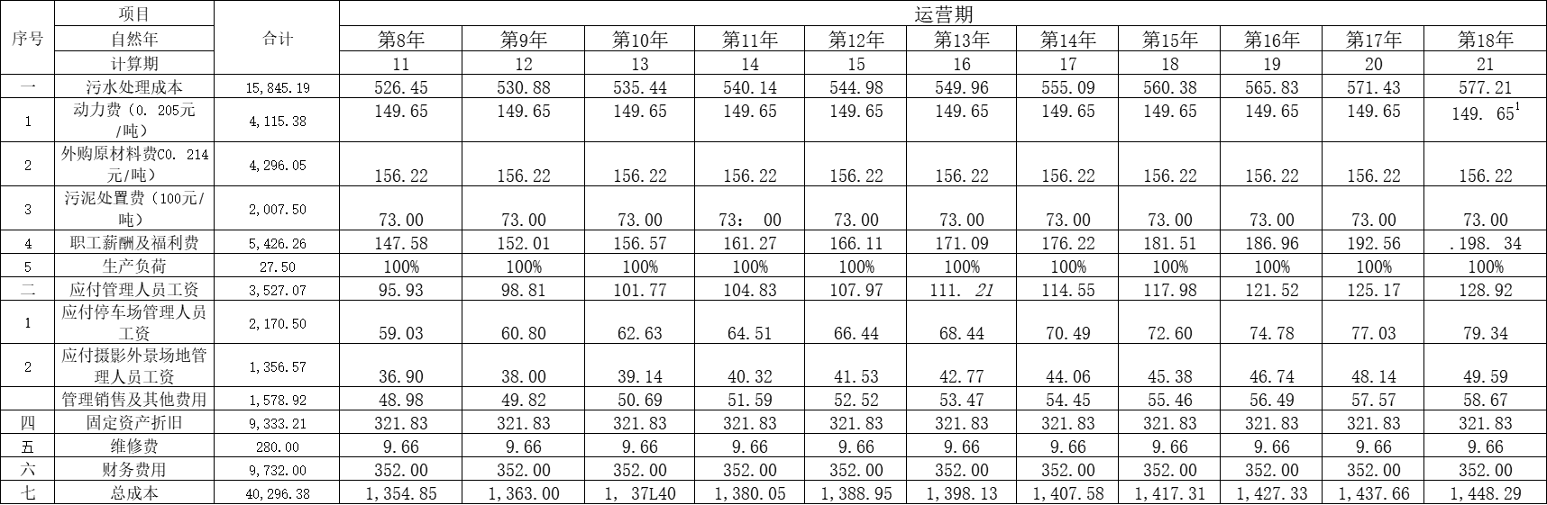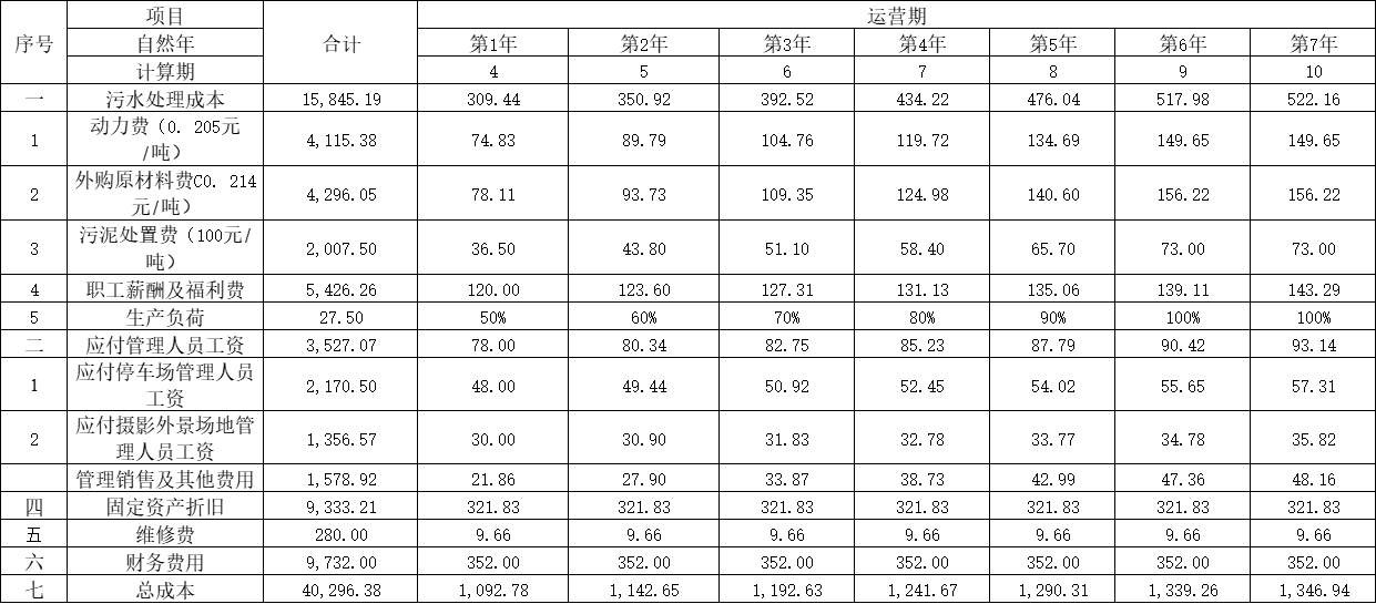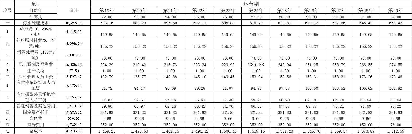 总成本与费用采用要素估算法计算,主要估算项目建成后运营期间的成本费用,主要包括污水处理成本、应付管理人员工资、管理销售及其他费用、固定资产折旧费用、维修费以及财务费用等。总成本40,296.38万元。详见下表: