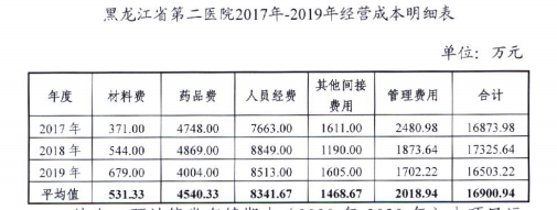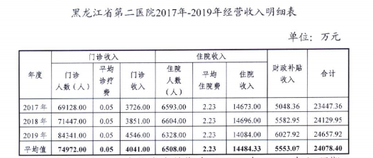 依据《黑龙江省第二医院2017-2019年度经营收入明细表》和项目可行性研究报告,黑龙江省第二医院近三年门诊平均收入4041.00万元,平均问诊人数74972人,平均人均门诊收费0.05万元;近三年平均住院收入14484.33万元,平均住院人数6508人,平均人均住院收费2.23万元。近三年平均财政补贴收入5553.07万元。考虑相关政策规定及哈尔滨市各医疗机构正常运行实际情况,以医院2017年-2019年运营收入平均数为测算基数预测,不考虑未来增长因素。