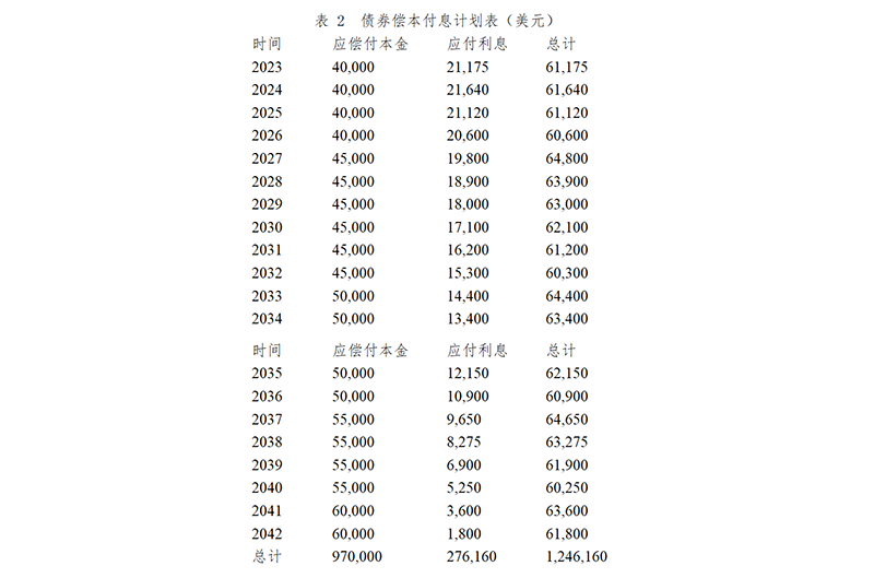 表 2 债券偿本付息计划表(美元)