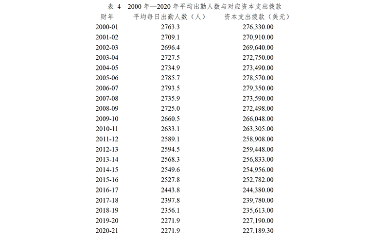 表 4 2000年—2020年平均出勤人数与对应资本支出拨款