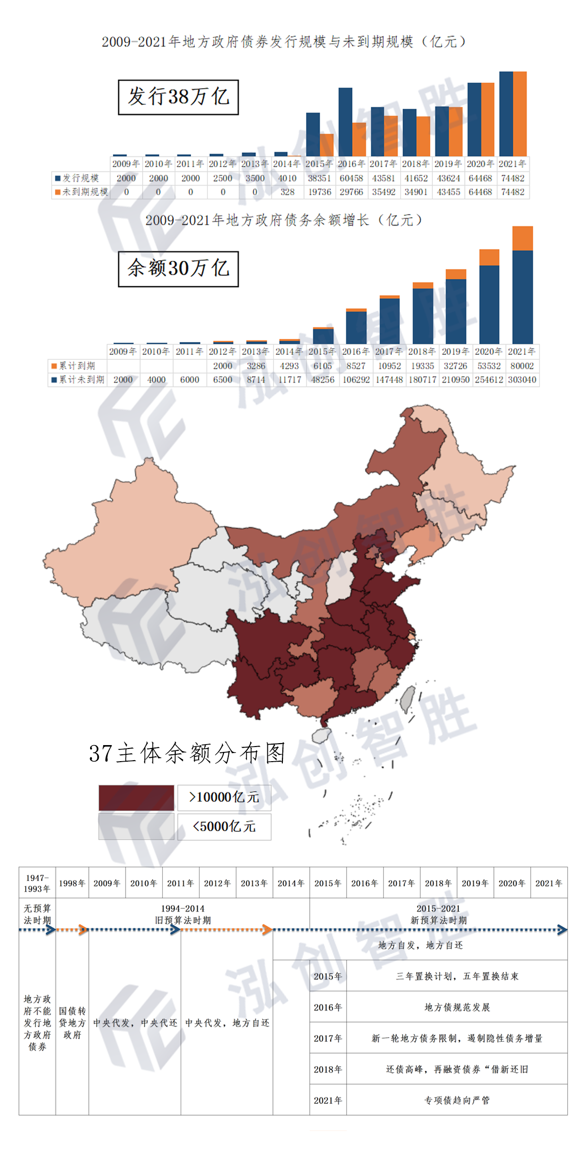 1、2009年开始发行地方债,2015年新预算法实施,地方债规模骤增至3.8万亿,开启地方债元年。截至2021年末,全国共发行地方政府债券38.3万亿元。2、截至2021年末,地方政府累计偿还地方债8万亿元,地方债余额30.3万亿元。3、地方债余额规模前五分别为江苏、广东、山东、四川、浙江,余额均超过1万元。4、2021年以来,专项债券趋向严监管,提出专项债券项目穿透式监管、绩效目标量化、对专项债券资金预算执行进度和绩效目标实现情况进行“双监控”。建国初期,“统收统支”财政体制下,地方财政自主管理权限小,收支缺口也主要依赖中央财政予以弥补。中央财政就允许各省、自治区和直辖市必要时发放债券来筹集建设资金,如建设地方经济折实公债、建设东北生产折实公债等,在某种程度上缓解了地方财政不足的窘境,可谓是地方政府债券的雏形。1985年,国务院《关于暂不发行地方政府债券的通知》。有些地方政府以筹集资金,解决基本建设资金不足问题为由,提出发行地方政府债券。国务院认为当前经济增长过快,投资增加过猛,如不加以控制,就会导致物价上涨。因此国务院要求各地政府目前不要发行地方政府债券。1994年,《中华人民共和国预算法》,第二十八条,地方各级预算按照量入为出、收支平衡的原则编制,不列赤字。除法律和国务院另有规定外,地方政府不得发行地方政府债券。1998年,亚洲金融危机之后,国家决定实施积极财政政策以刺激经济增长。《国债转贷地方政府管理办法》,第一条,为了扩大有效内需,促进国民经济持续稳定发展,国务院决定1998年增发一定数量的国债,由财政部转贷给省级(包括省、自治区、直辖市及计划单列市,下同)政府,用于地方的经济和社会发展建设项目。办法明确了转贷资金的拨付、使用和偿还,省级人民政府在本省范围内统借、统筹、统还,省级财政部门负责对财政部的还本付息工作。2009年,财政部代发2000亿元3年期债券,2010至2011年均发行1000亿元3年期债券和1000亿元5年期债券。